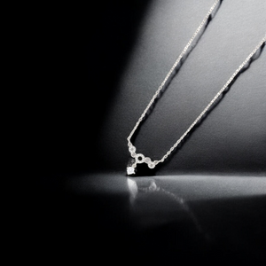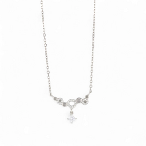 This silver necklace features a branch of a circular motif dangling below, studded with zircons.