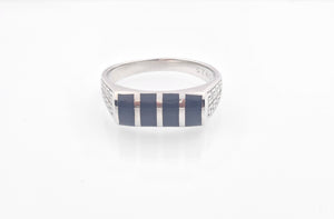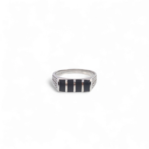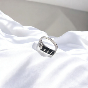 This classic silver ring for men has an black enamels etched at the centre. It is flanked by intricate cut-out designs on the band.